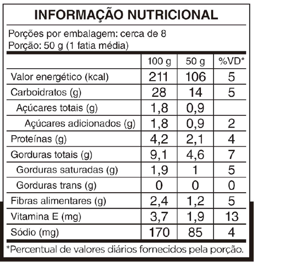 Ingredientes Ovo, água, polvilho doce, farinha de arroz integral, fécula de batata, biomassa de banana verde, óleo de girassol, açúcar demerara, fermento biológico, cúrcuma, vinagre de maçã, semente de chia, semente de abóbora e sal rosa do Himalaia.